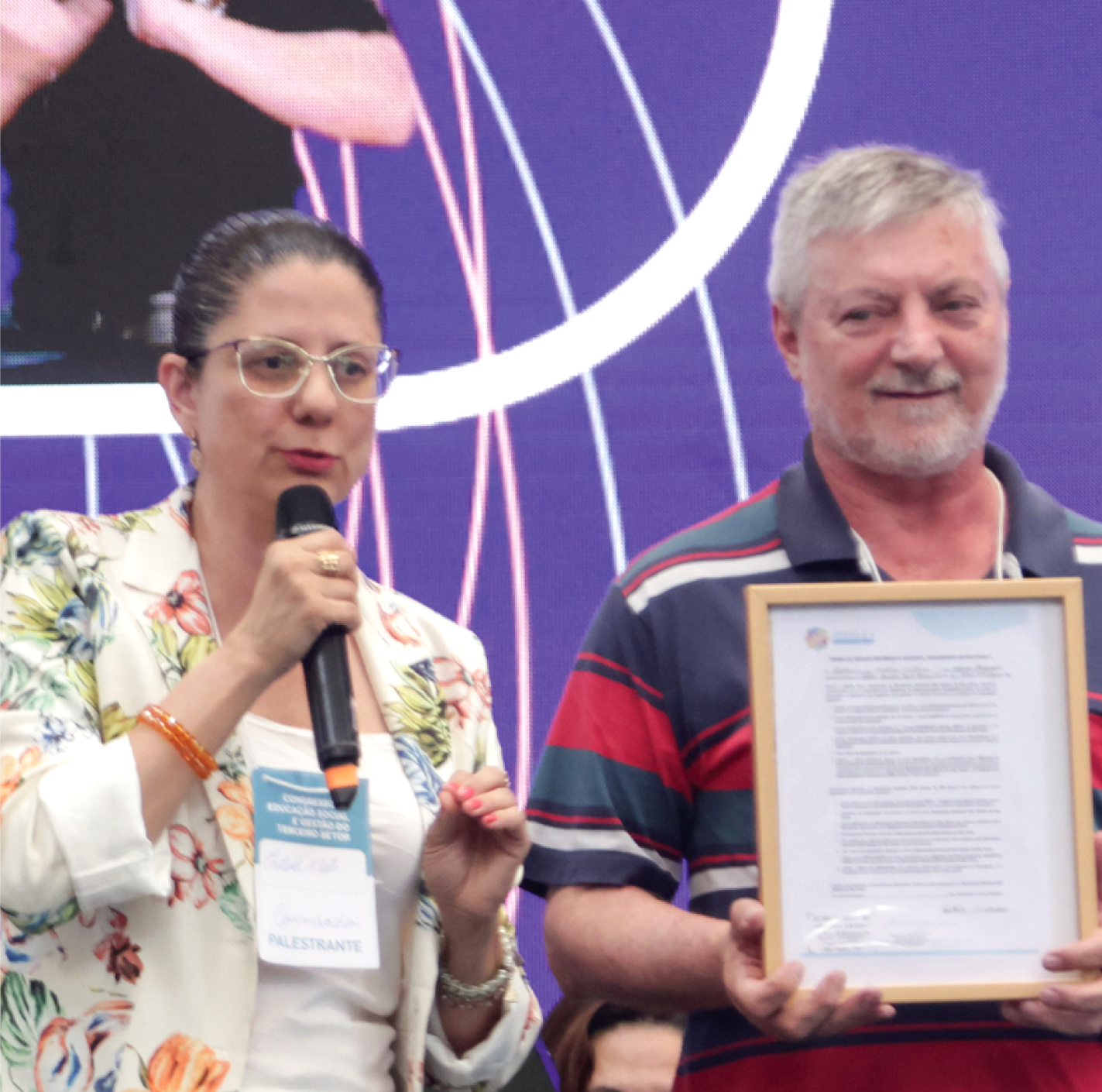 Finalizando essa 4ª edição do Congresso de Educação Social e Gestão do Terceiro Setor, Erika Mota entregou um ofício ao Padre Aramis Biaggi, Diretor Geral da Presença Salesiana de Itaquera, designando a Obra Social Dom Bosco de Itaquera como Signatária do Desenvolvimento Sustentável, um documento oficial reconhecido pela ONU.