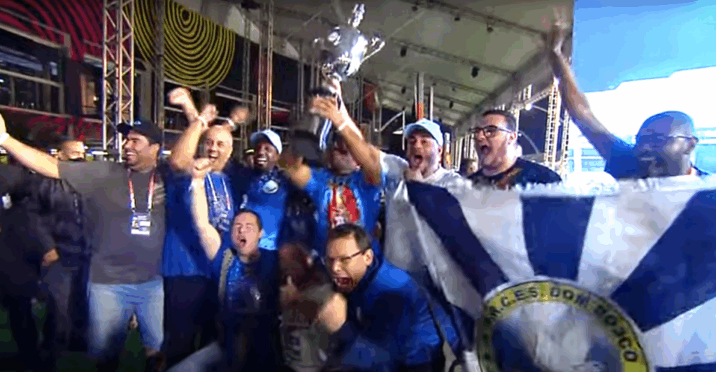 Integrantes da Dom Bosco, presentes na apuração, erguem o troféu do vice-campeonato