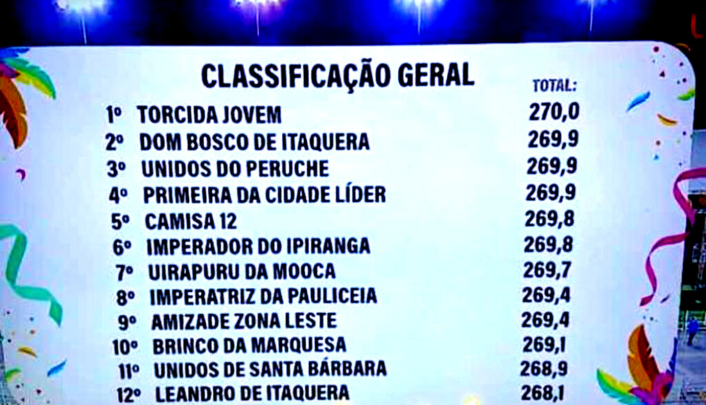 Por ser a última das 12 agremiações do Acesso II a desfilar, a escola viveu o nervosismo até o término da apuração para conferência de suas notas. A “Imperador do Ipiranga”, que ocupava a segunda colocação, perdeu em “Fantasia”, último quesito a ser julgado, os dois décimos necessários para reposicionar a Dom Bosco na classificação, atrás apenas da “Torcida Jovem”, que se consagrou como a grande campeã de 2023.