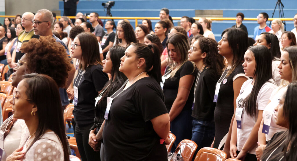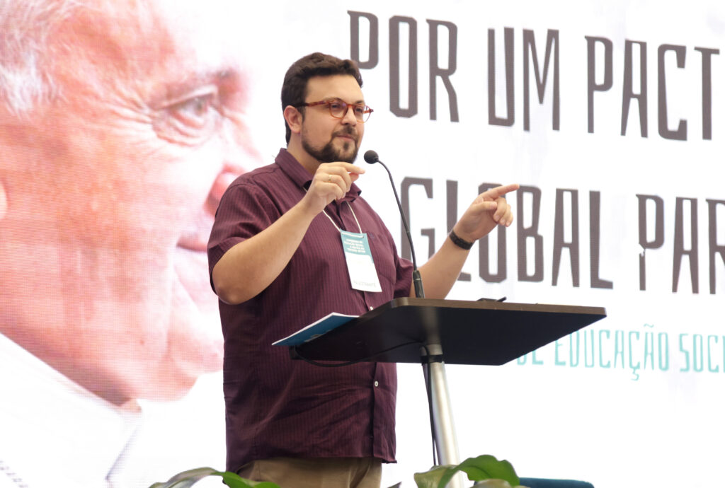 Na sequência, foi a vez do Educador e Sociólogo, o Prof. Ms. Eduardo Brasileiro, falar “Por um Pacto Educativo Global para o Brasil”. Durante sua fala, Brasileiro destacou que a educação, sem o encontro, não é nada. Ele também enfatizou o período de “hiperconectividade” e do “hiperconsumo” que está erodindo a ação política e a esfera pública comum. “A sociedade já aceitou o colapso climático e, nessa sociedade que aceitou o colapso, resolvemos nos render aos processos de inovação e tecnologia que, às vezes, não correspondem aos anseios principais da dignidade humana”, destacou.