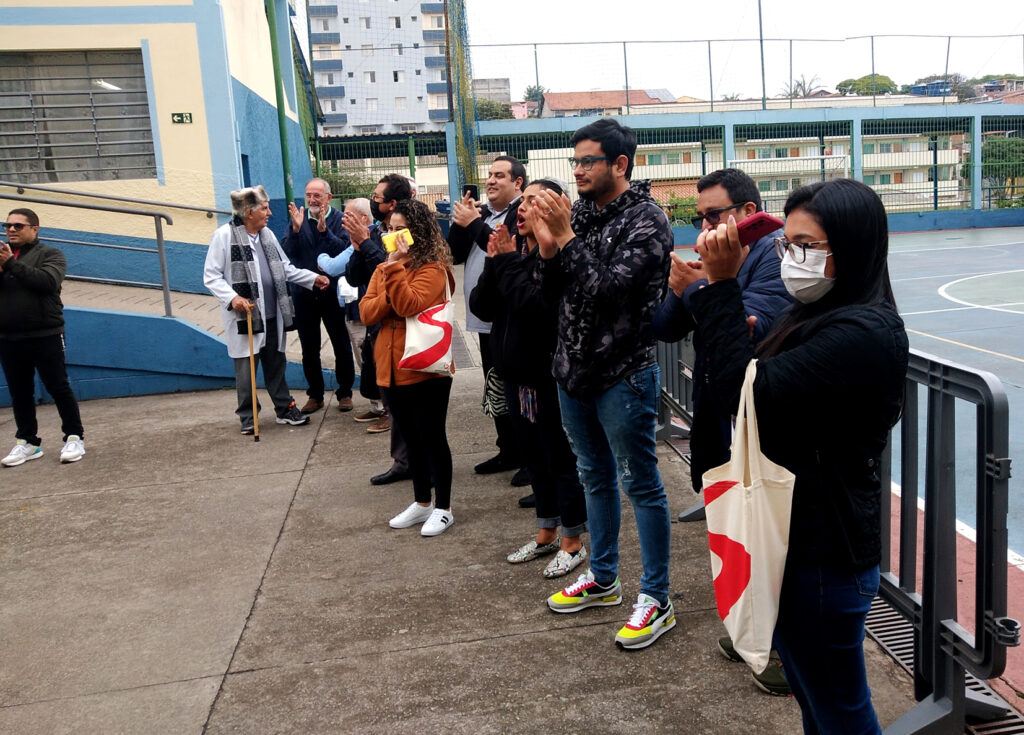 O grupo chegou por volta das 10h30 da manhã na unidade do Circo Social, ao lado do metrô Corinthians-Itaquera, acompanhados do nosso diretor presidente e fundador, o padre Rosalvino Morán Viñayo, e do vice-diretor, o irmão Antonio Carlos.