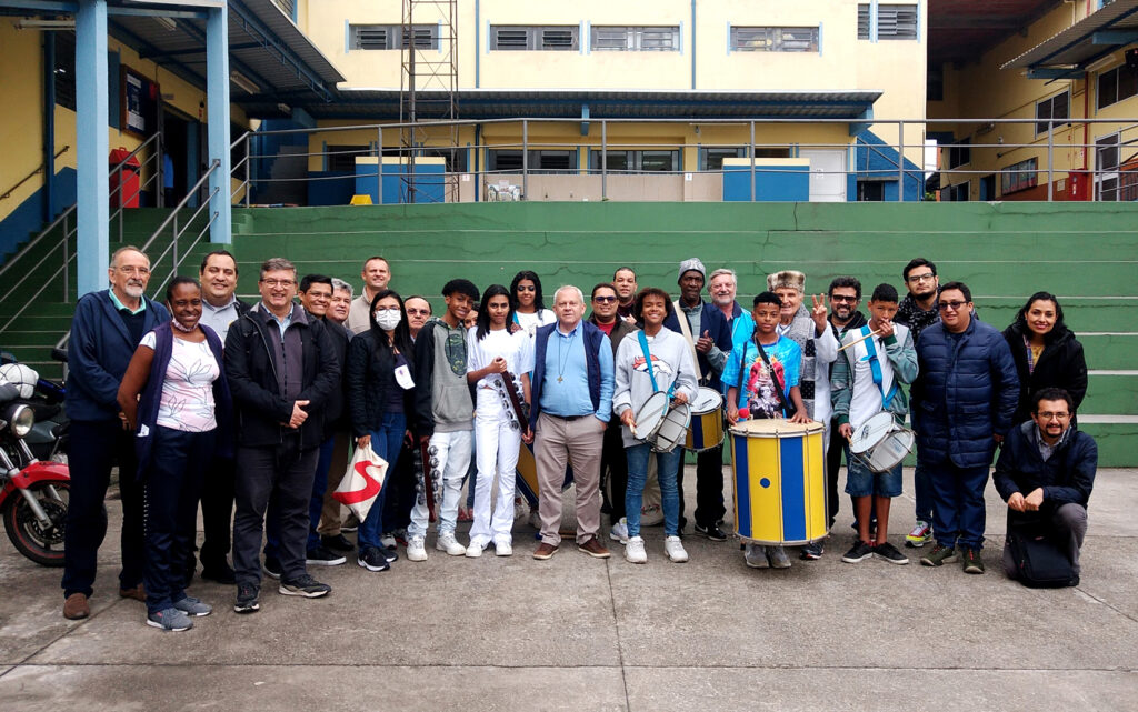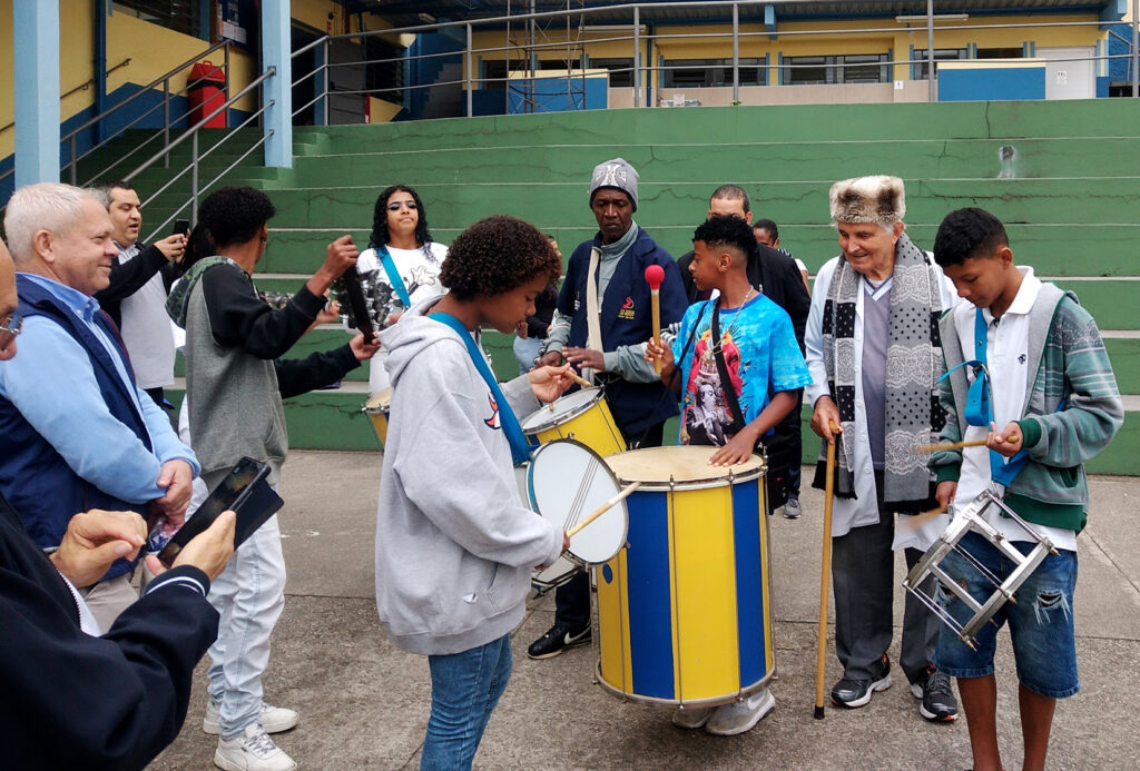 Após o almoço, o grupo se deslocou até a nossa sede para conhecer as instalações e os cursos profissionalizantes oferecidos no Centro de Desenvolvimento Social e Produtivo (CEDESP). Os participantes do Encontro foram recepcionados pelo nosso diretor-tesoureiro, padre Aramis Francisco Biaggi, e por uma apresentação de percussão dos jovens e adolescentes do CCA Aparecida, que empolgou e animou os presentes, em meio a fria tarde em São Paulo, com temperatura na casa dos 16º, 18º graus celsius.